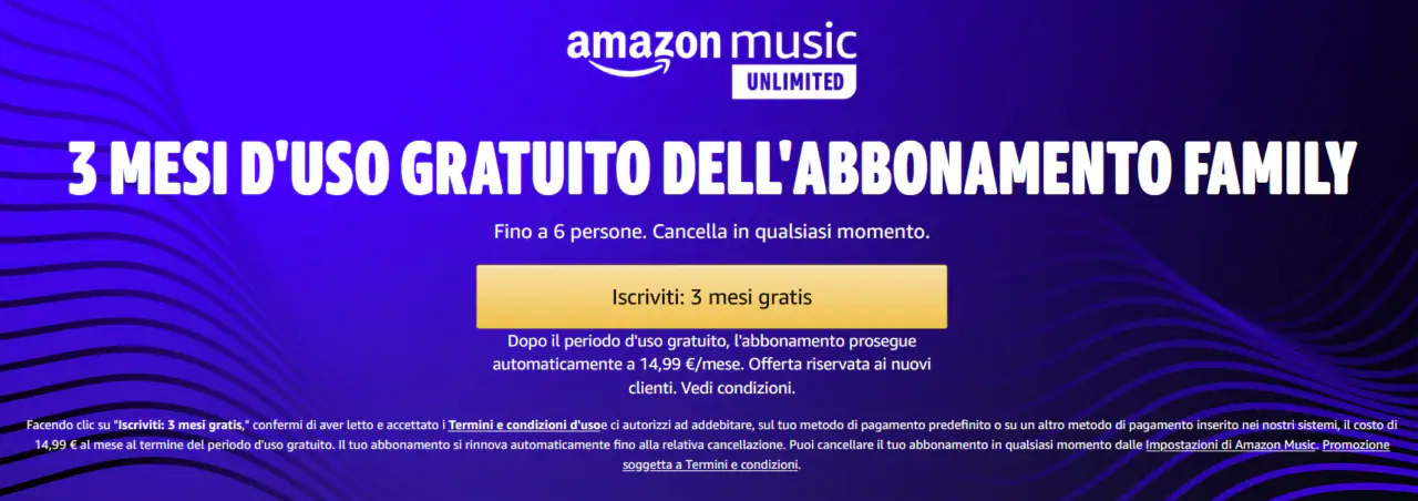 Quindi 3 mesi di musica completamente GRATIS per 6 persone. La promozione vale solo per chi non si è mai iscritto prima ad Amazon Music Unlimited. Dopo i primi 3 mesi gratuiti, l’abbonamento costerà 14,99€ al mese ma se volete soltanto sfruttare l’omaggio, vi consigliamo di iscrivervi e subito di annullare, immediatamente dopo, il rinnovo automatico. Questo è il link diretto per farlo.