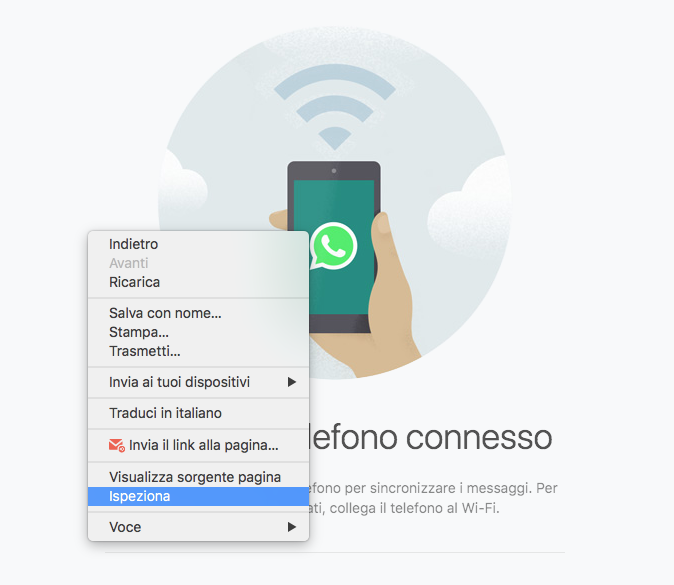 3. Adesso posizionate il mouse alla destra dell’elenco delle chat, nella parte in cui si leggono le conversazioni, e cliccate il tasto destro > Ispeziona (se siete su Chrome)