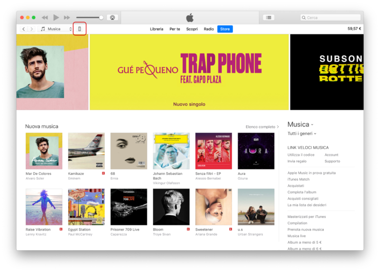 Assicuratevi di avere l’ultima versione di iTunes installata sul vostro computer. Collegate l’iPhone tramite cavetto Lightning al computer e cliccate sull’icona del dispositivo che trovate nella parte alta di iTunes.