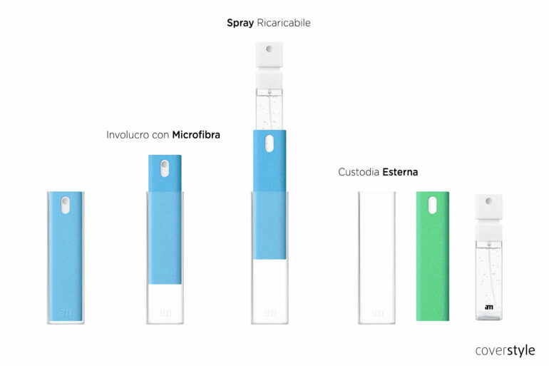 Lo spray antibatterico all-in-one è realizzato con una struttura modulare, ovvero: una custodia trasparente esterna (solo versione Piccola), un involucro plastico avvolto da microfibra e al centro lo spray vero e proprio. Ovviamente il prodotto è ricaricabile.