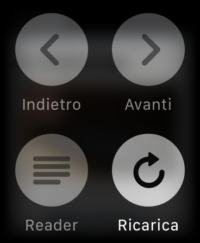 - Per tornare indietro alla pagina precedente, spostate il dito dalla parte sinistra dello schermo, verso destra. In alternativa, toccate con il Force Touch al centro dello schermo ed appariranno nuovi bottoni: Indietro, Avanti, Reader e Rircarica