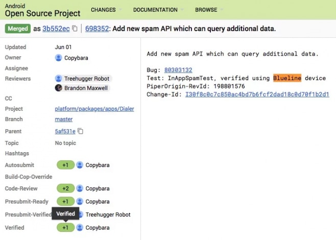 Il codice è comparso a fianco di un commit riguardo una “nuova API spam” nel compositore telefonico di Android. Più precisamente, chi ha sottomesso il commit indica che la API è stata “verificata con un dispositivo Blueline“.