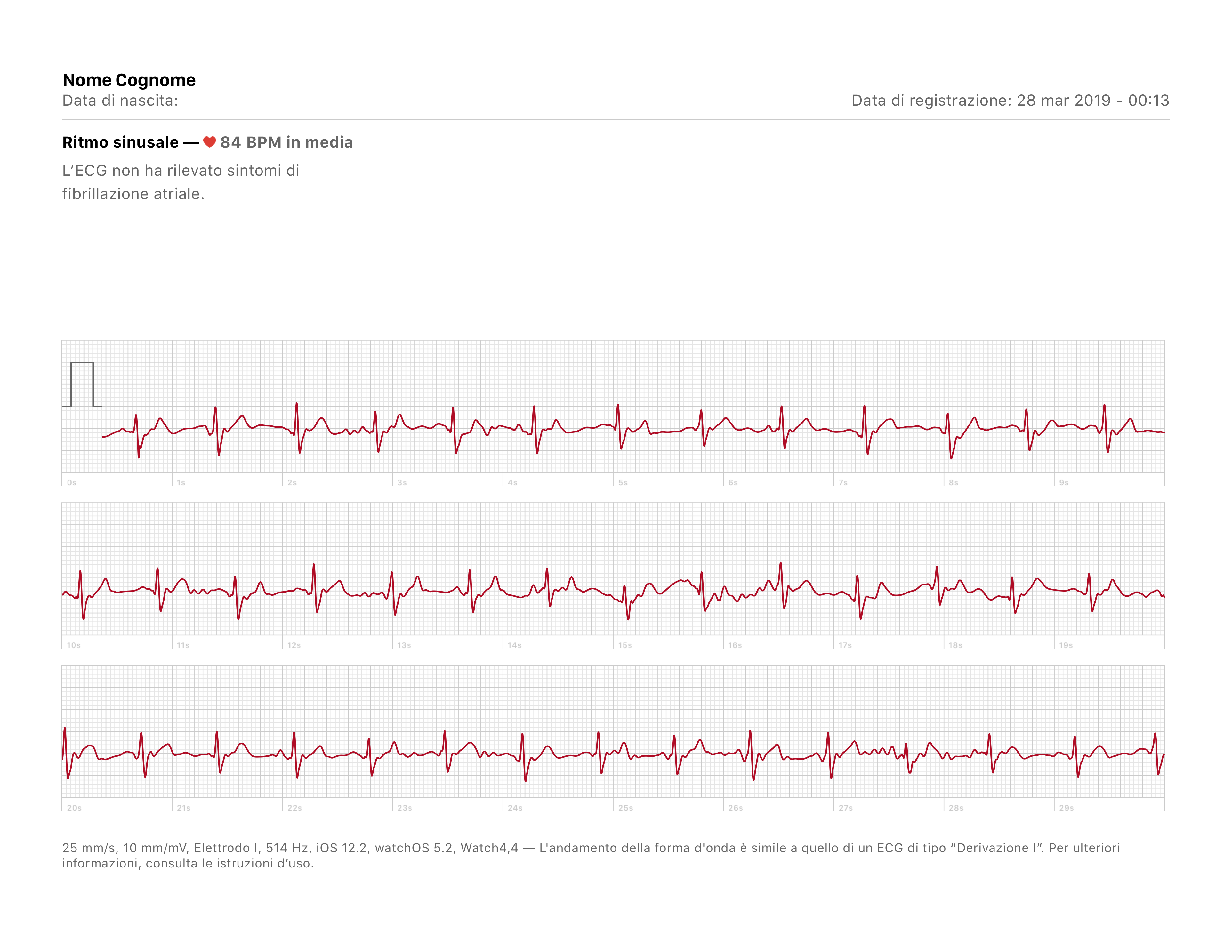 25 mm/s, 10 mm/mV, Elettrodo I, 514 Hz, iOS 12.2, watchOS 5.2, Watch4,4 — L’andamento della forma d’onda è simile a quello di un ECG di tipo “Derivazione I”. Per ulteriori informazioni, consulta le istruzioni dʼuso.