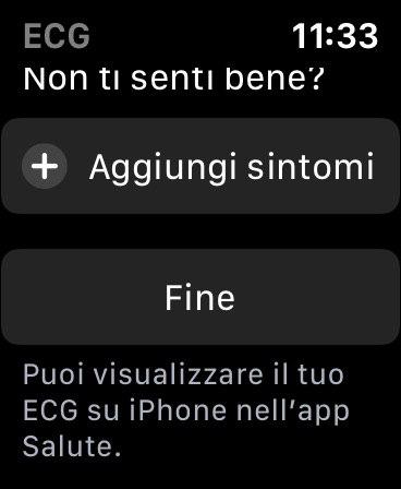 Il risultato indica che non è possibile classificare l’elettrocardiogramma. Questo può avvenire per diverse ragioni, ad esempio, potresti non aver poggiato correttamente il braccio durante la registrazione o Apple Watch non aderiva correttamente al polso.