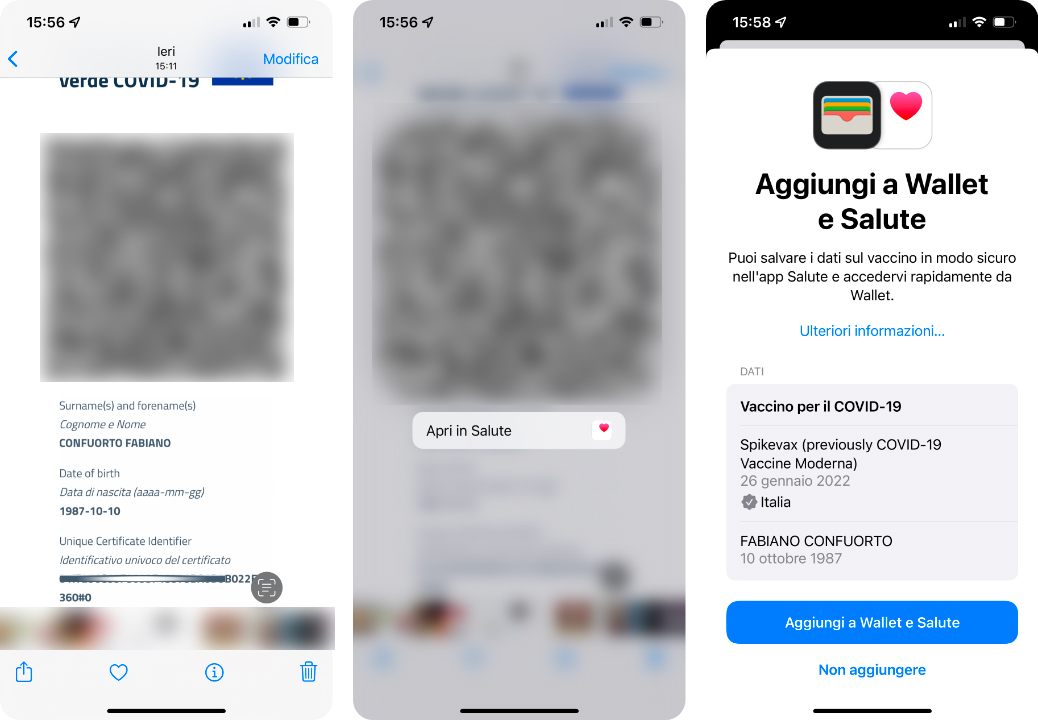 Primo metodo: Come aggiungere il GreenPass nell’applicazione Wallet e Salute con la fotocamera su iOS 15.4 e successivi