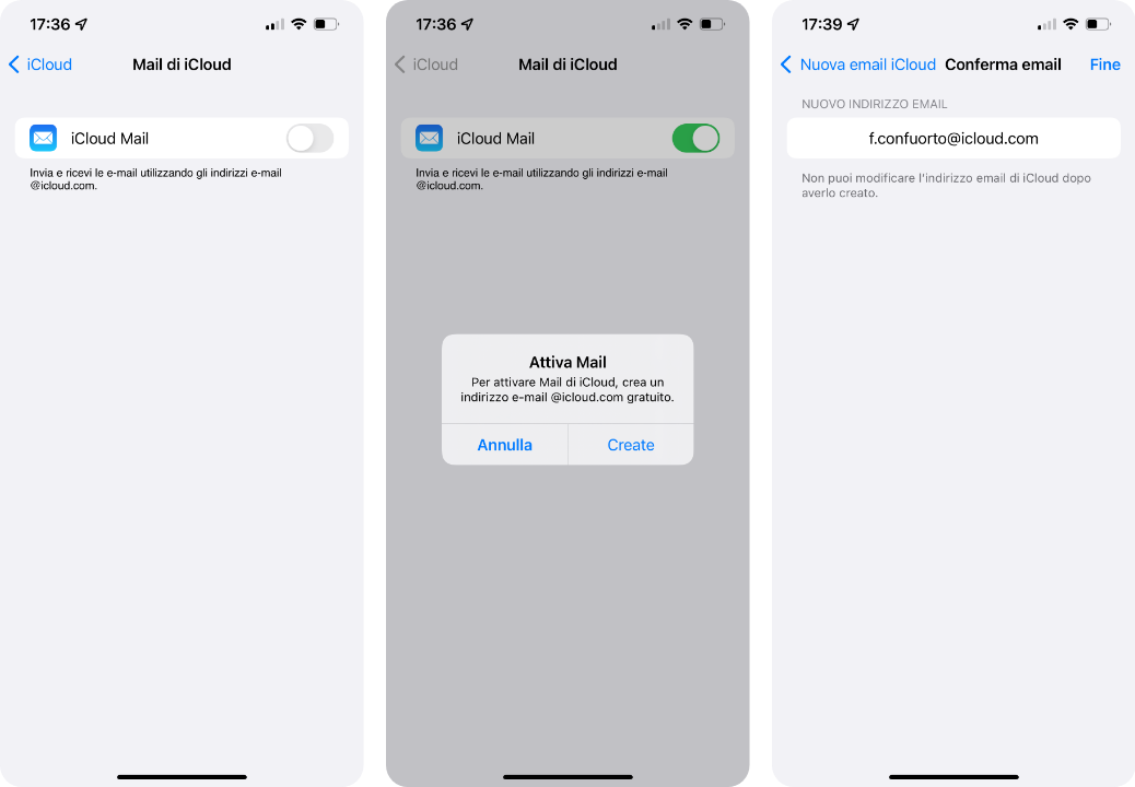 1. Aprite l’applicazione Impostazioni, cliccate sul vostro nome in cima all’elenco e poi su iCloud. Adesso toccate Mail di iCloud ed attivate l’interruttore. Un popup vi inviterà a creare il vostro indirizzo di posta elettronica @icloud.com. Cliccate sul tasto Crea per confermare e poi scegliete il vostro indirizzo email come ad esempio nome.cognome@icloud.com.