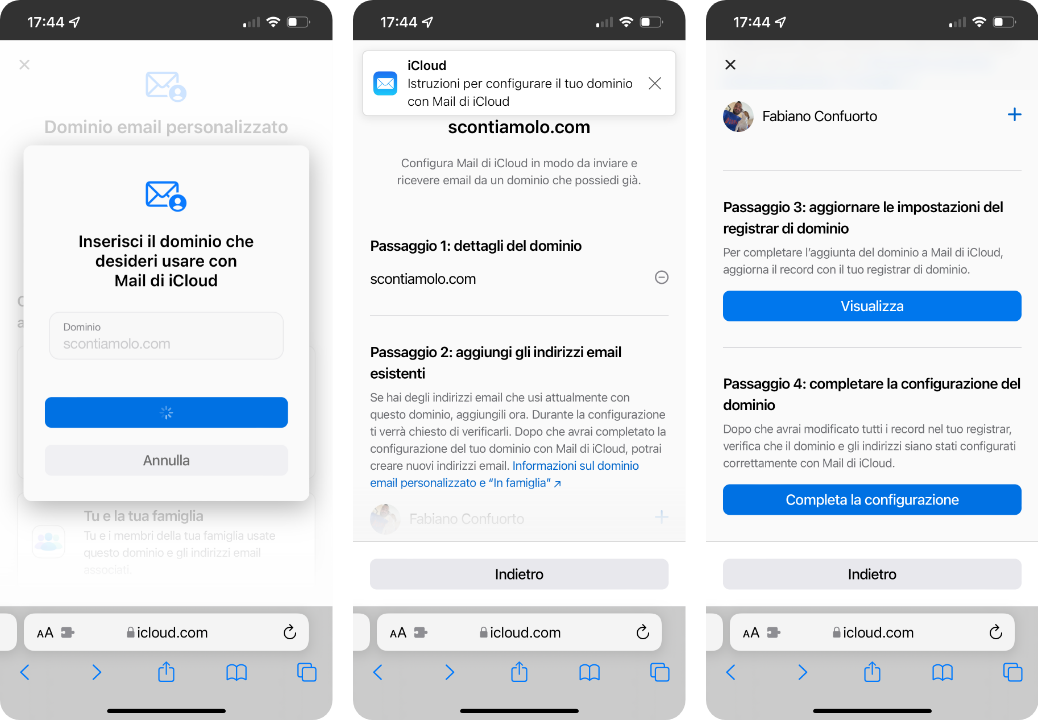 3. Finalmente arriveremo al passaggio in cui inseriamo il nostro dominio. Io ho inserito scontiamolo.com perchè sono interessato a creare un’email personalizzata di tipo fabiano@scontiamolo.com. Continuando verrà aperto il sito web di iCloud con ulteriori istruzioni da seguire.