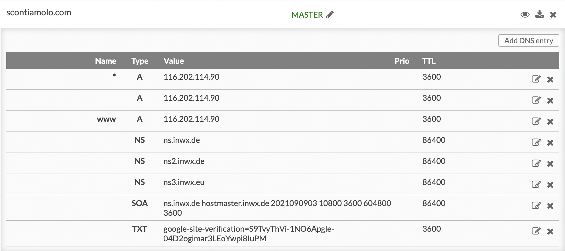 | TXT | [il_tuo_dominio.com] | inserire il valore fornito da Apple | 10 | 3600 |