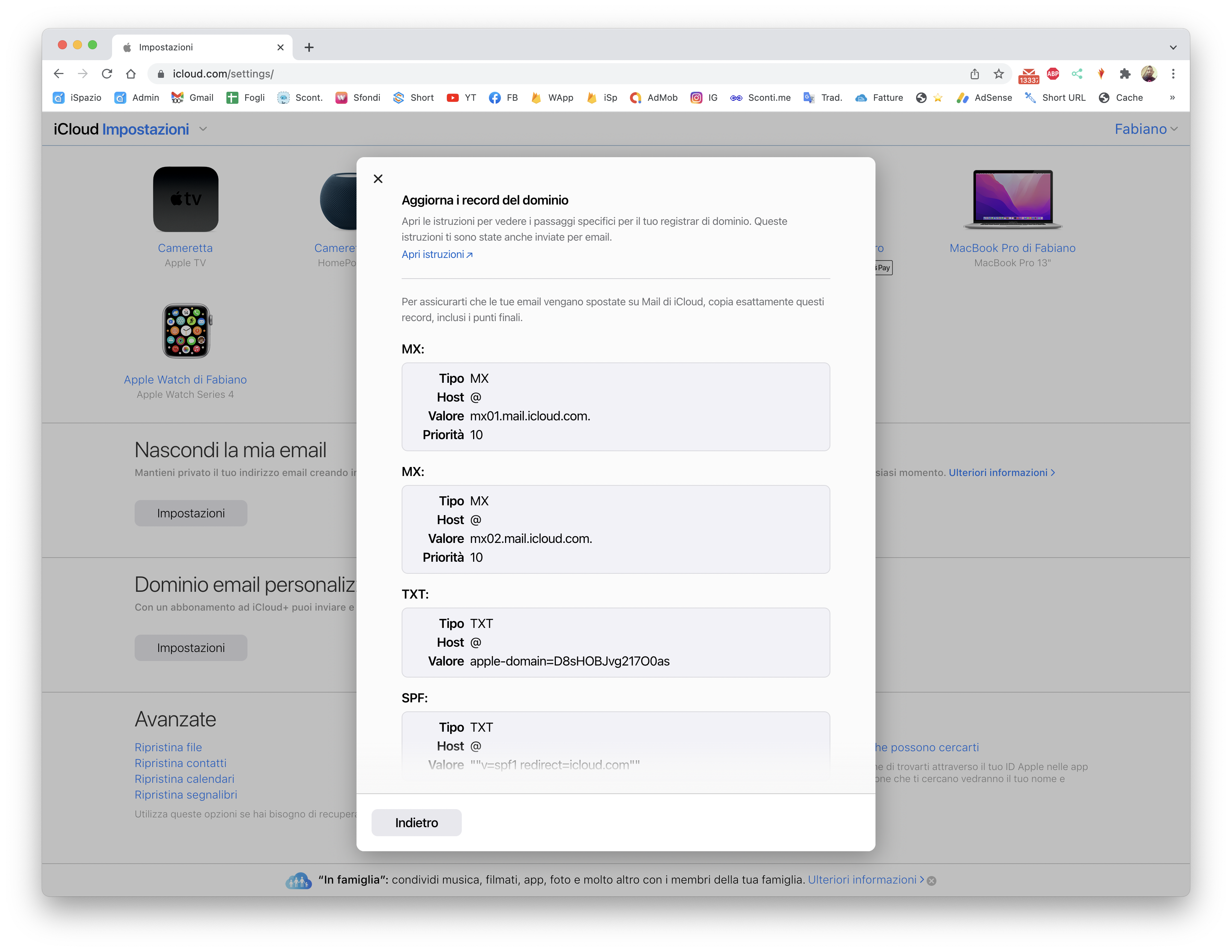 Da qui bisognerà aggiungere dei nuovi record al dominio scelto. Una schermata sul sito di iCloud vi mostrerà tutto quello che va aggiunto o tutti i valori che vanno modificati a qualche record già esistente (come TXT).