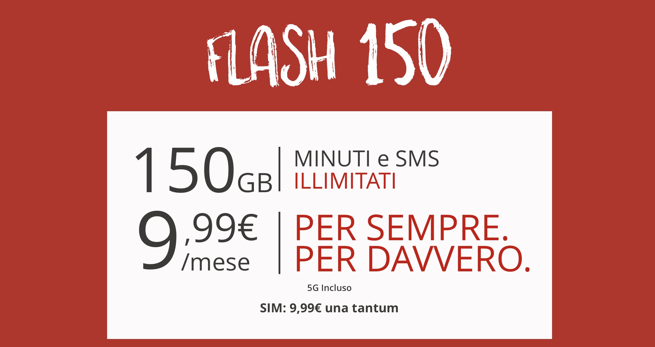 Ben 150 GB di traffico internet con Minuti ed SMS illimitati a soli 9,99€ al mese per sempre e per davvero. Un’offerta a cui è praticamente impossibile resistere considerando che include anche il 5G come velocità di navigazione.