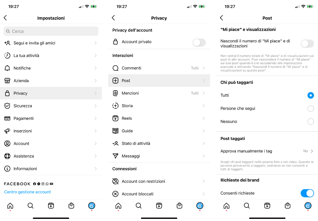 Nota: Se non avete la voce “Post”, allora entrate in “Tag” e qui troverete lo stesso interruttore da disattivare per riuscire a visualizzare i Mi Piace.