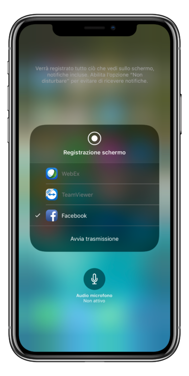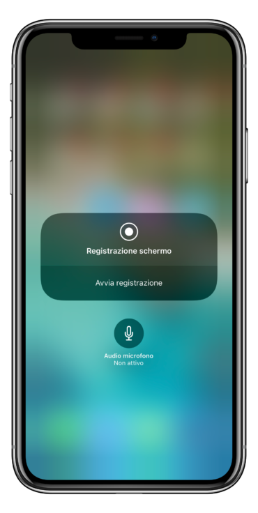 A questo punto possiamo uscire dalle impostazioni, avviare il centro di controllo e fare una pressione decisa (3D touch) sul nuovo tasto aggiunto così da accedere alla nuova schermata in cui potremo selezionare l’app che preferiamo fra quelle disponibili, attivare la registrazione dal microfono e poi avviare anche la registrazione stessa.