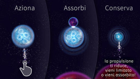 Un gioco nel quale divremo far sopravvivere una particella superando vari livelli disseminati dalle quotidiane insidie che può incontrare una neo-nata molecola di ossigeno nell’immenso spazio. Dovremo nutrirci, mangiando molecole piccole ed accrescendo la nostra dimensione fino a diventare giganti e riuscire a mangiare qualunque cosa, senza più ostacoli.