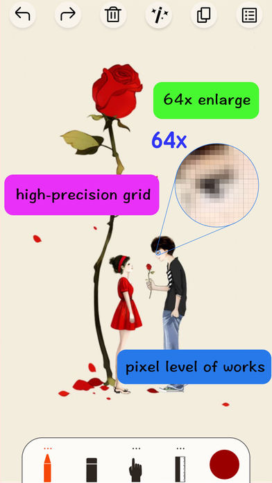 Fantastica applicazione di disegno per il nostro iPhone Pratica e innovativa, offre una vastissima gamma di pennelli realistici e acquerelli, strumenti di pittura con funzionalità complete, gomme da cancellare, tool per la realizzazione di particolari, righello, cutter ecc. La tela può essere ingrandita, inoltre, 64 volte con una griglia ad alta precisione e la grafica è precisa a livello di pixel.