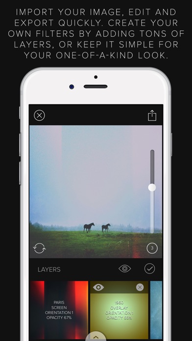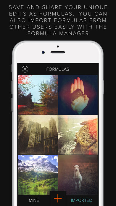 Uno strumento per applicare la classica grana della pellicola, texture, perdite di luce e belle sfumature alle vostre immagini in pochi secondi. Nessuna applicazione è più veloce. E’ possibile possibile apportare modifiche in qualsiasi momento durante il processo di editing, affinare le proprie modifiche con regolazioni di foto e quindi salvare e condividere le modifiche per un uso futuro. Inoltre, sono disponibili più di 200 belle formule per un facile montaggio 1 click creato da alcuni dei migliori fotografi del settore in tutto il mondo.