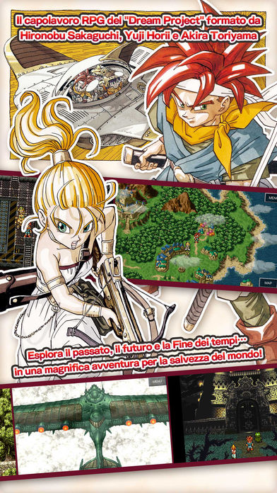Dai creatori di “Dream Team” “DRAGON QUEST”, “Dragon Ball” e dai creatori di “FINAL FANTASY” questo gioco mobile è di sicuro un apprezzabilissimo titolo tra i GDR. Intraprendi un’epica ricerca per salvare il futuro di un pianeta e mentre la storia si svolge, comincia un lungo viaggio in epoche diverse: il presente, il medioevo, il futuro, la preistoria, la salvezza è solo nelle tue mani!