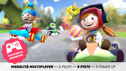 Race game ispirato a “Mario Kart”, adatto ai bambini ma giocabile da tutti, offre 4 grandi modalità di gioco diverse, 6 diversi piloti, 8 piste possibilità di gareggiare suddividendo lo stesso schermo o giocare partite multiplayer locali con un massimo di 6 dispositivi.
