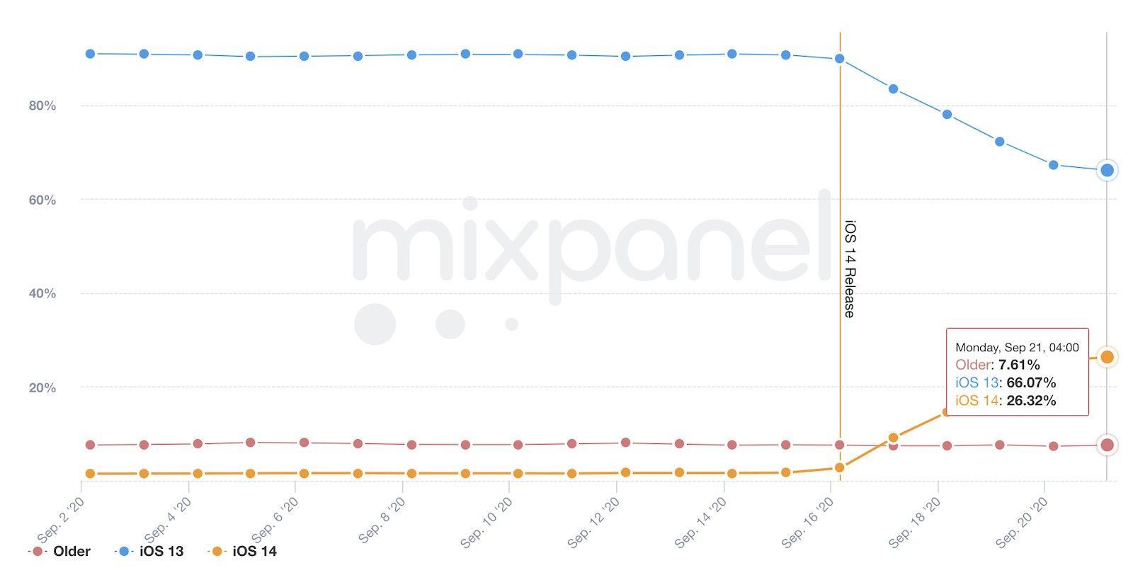 Secondo i nuovi dati condivisi questa settimana dalla società di analisi Mixpanel, iOS 14 è installato su circa il 26% dei dispositivi iPhone, iPad e iPod touch attivi. I dati comprendono anche iPadOS 14.