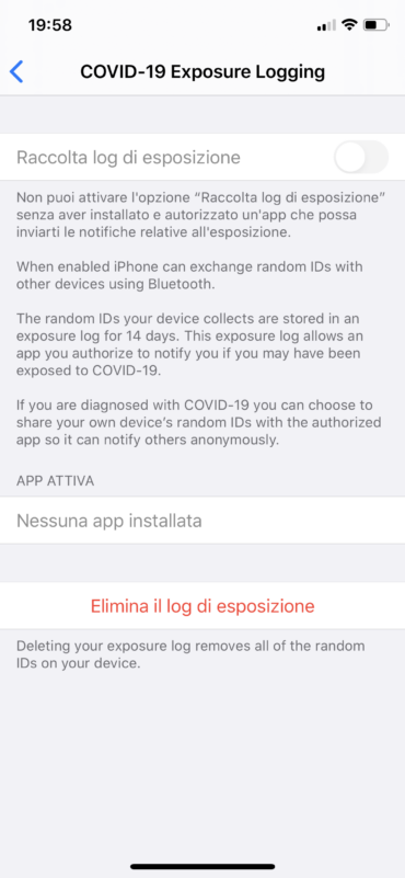 Come possiamo vedere nello screenshot qui sopra, non possiamo attivare la registrazione dell’esposizione senza un’app autorizzata da un’autorità sanitaria pubblica. Ora possiamo anche eliminare i registri di esposizione e gestire le applicazioni installate.