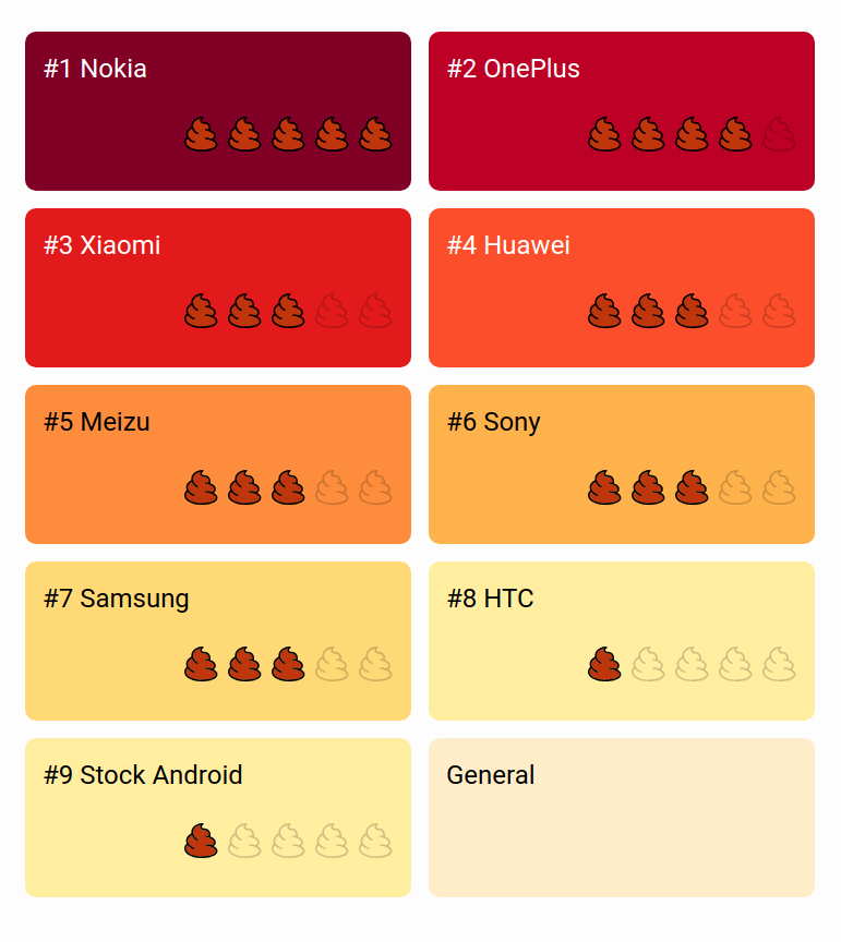 Per salvaguardare la carica del dispositivo infatti il sistema tende a terminare le applicazioni che girano in background. Alcuni produttori però sono più aggressivi di altri. È per questo che un gruppo di sviluppatori si è organizzato e ha messo in piedi Don’t kill my app dove vengono tracciati i comportamenti di ogni azienda. Il sito propone una classifica (la potete vedere anche qui sotto) che riporta il giudizio assegnato dagli sviluppatori sotto forma di “cacchine”.