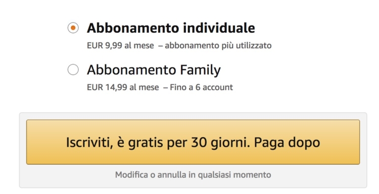 2. Nella pagina successiva, scegliete se desiderate provare un account individuale a 9,99€ al mese oppure Family a 14,99€ (che potrete condividere con amici e parenti fino ad un massimo di 6 persone). Non temete, non state per pagare questa cifra. Continuate a seguire questa guida e vi spiegheremo anche come rimuovere il rinnovo automatico dell’abbonamento dopo il primo mese.