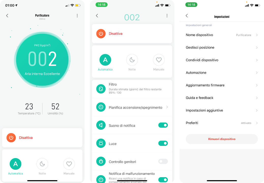 Tendenzialmente vi consigliamo di lasciare sempre su “Automatico“, anche di notte, malgrado la presenza di un’apposita modalità notturna che tendenzialmente è più silenziosa perchè tiene le ventole alla minima potenza. Quando l’aria in casa o nella stanza in cui avete posizionato il purificatore è buona, la rumorosità della ventola è impercettibile anche con la modalità “Automatica”. Impostando su Manuale invece, potrete regolare a vostro piacimento la potenza. Può essere utile in alcuni casi ma parliamo di circostanze molto molto limitate.