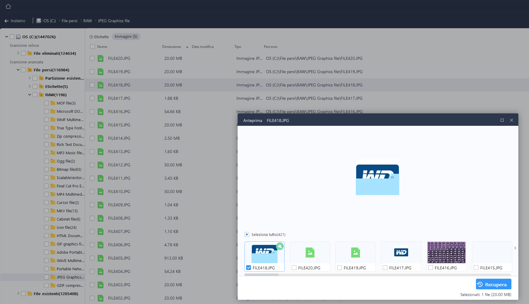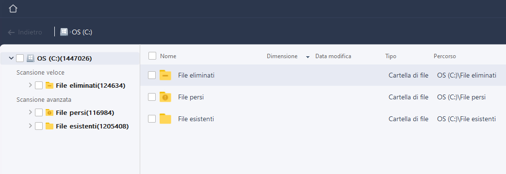 I file vengono catalogati in base a “File Eliminati” e “File Persi”. Molti di questi sono ovviamente file generati dal sistema, che quindi difficilmente potranno interessare l’utente medio, ma altrettanti sono foto, documenti, archivi che nel tempo sono stati eliminati.