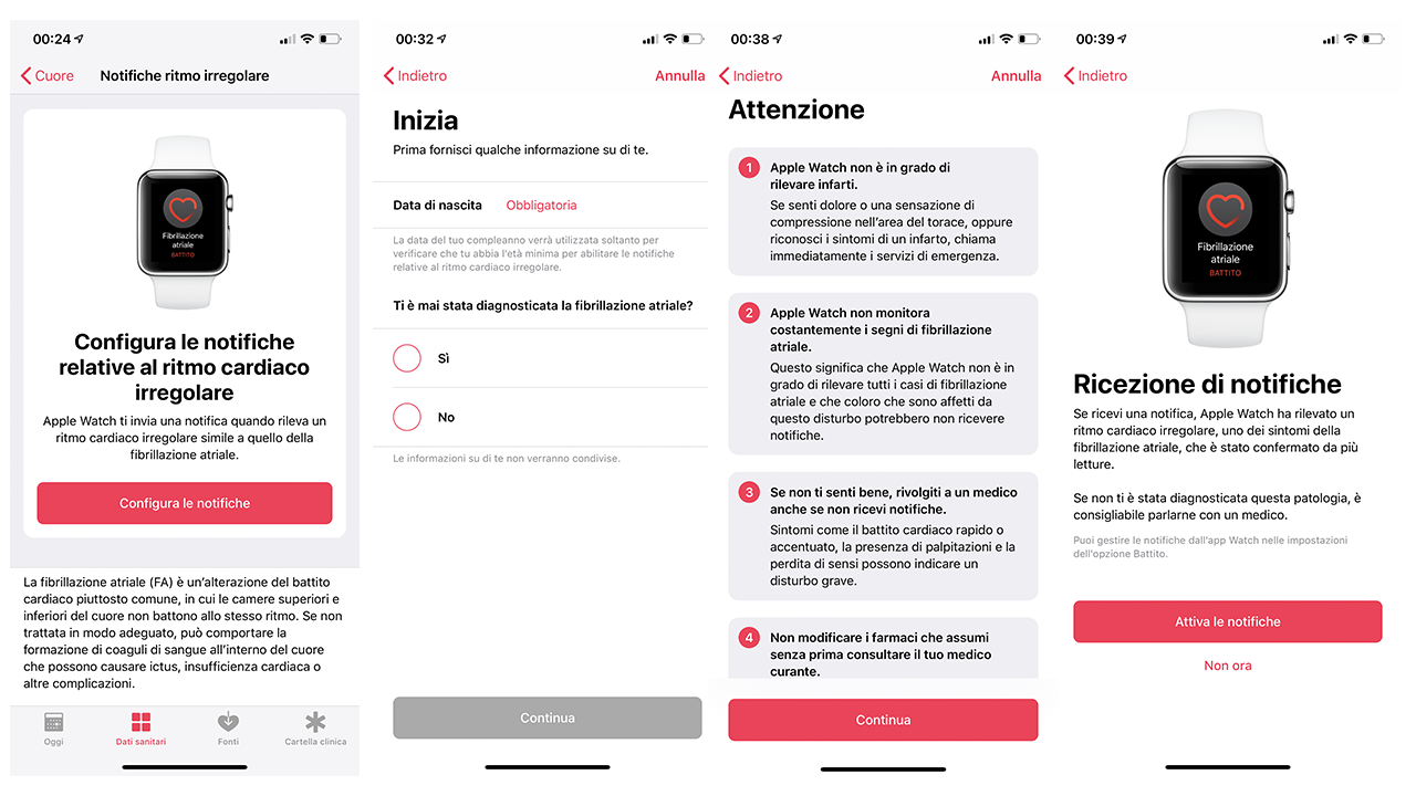 La funzionalità di notifica di aritmia è disponibile su Apple Watch Series 1, 2, 3 e 4 con watchOS 5.2 o versioni successive, abbinato a iPhone 5s o modelli successivi con iOS 12.2 o versioni successive. Ecco le indicazioni per attivare la funzionalità:
