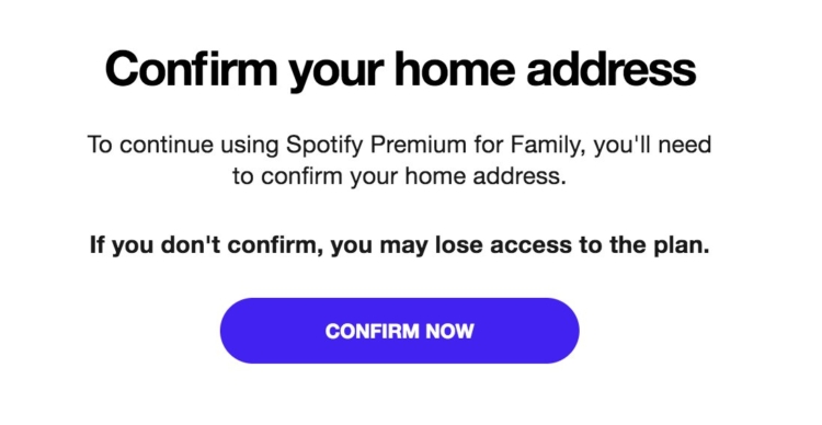 Spotify sta attualmente testando dei miglioramenti per l’esperienza utente abbonati tramite un piano Family. Testiamo continuamente nuovi prodotti ed esperienze. Da questo momento in poi questa conferma dell’indirizzo tramite GPS non apparirà più a nessuno.