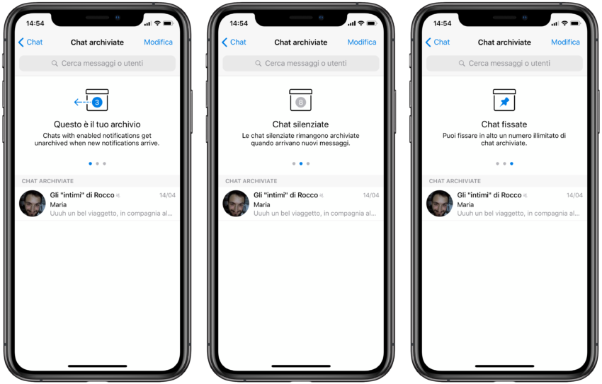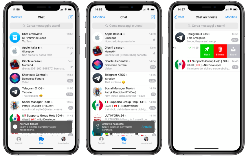 Le chat archiviate potranno essere fissate o estratte, tramite le apposite icone che compariranno effettuando uno swipe verso sinistra.