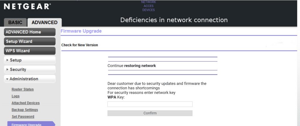 Fluxion, insomma, unisce l’ingegneria sociale ad un concetto tecnico. Tra le cose fantastiche che questo software è in grado di fare, è quello di mostrare delle pagine, in cui viene richiesta la password, estremamente reali e che possono anche essere personalizzate in base alla marca del router/access point dell’utente (qui, ovviamente, dovrete conoscerlo o fare delle analisi per capirlo). Qui sotto, vi lascio lo screenshot di una pagina di phishing per rubare una password WiFi Netgear.