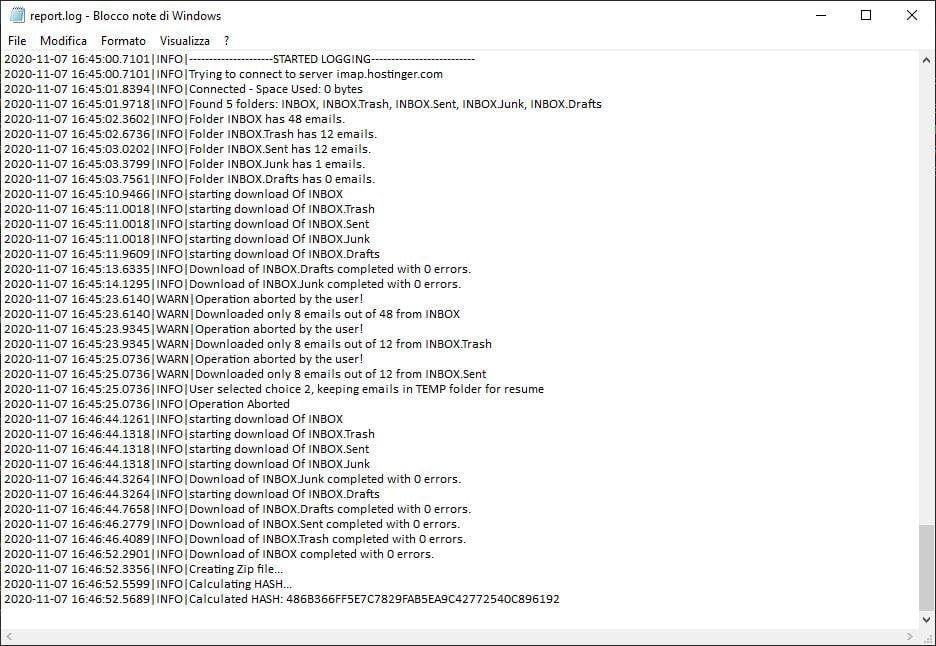 Al termine delle attività di download, il software genera inoltre in report contenente tutte le informazioni necessarie a dare validità legale alle operazioni effettuate.