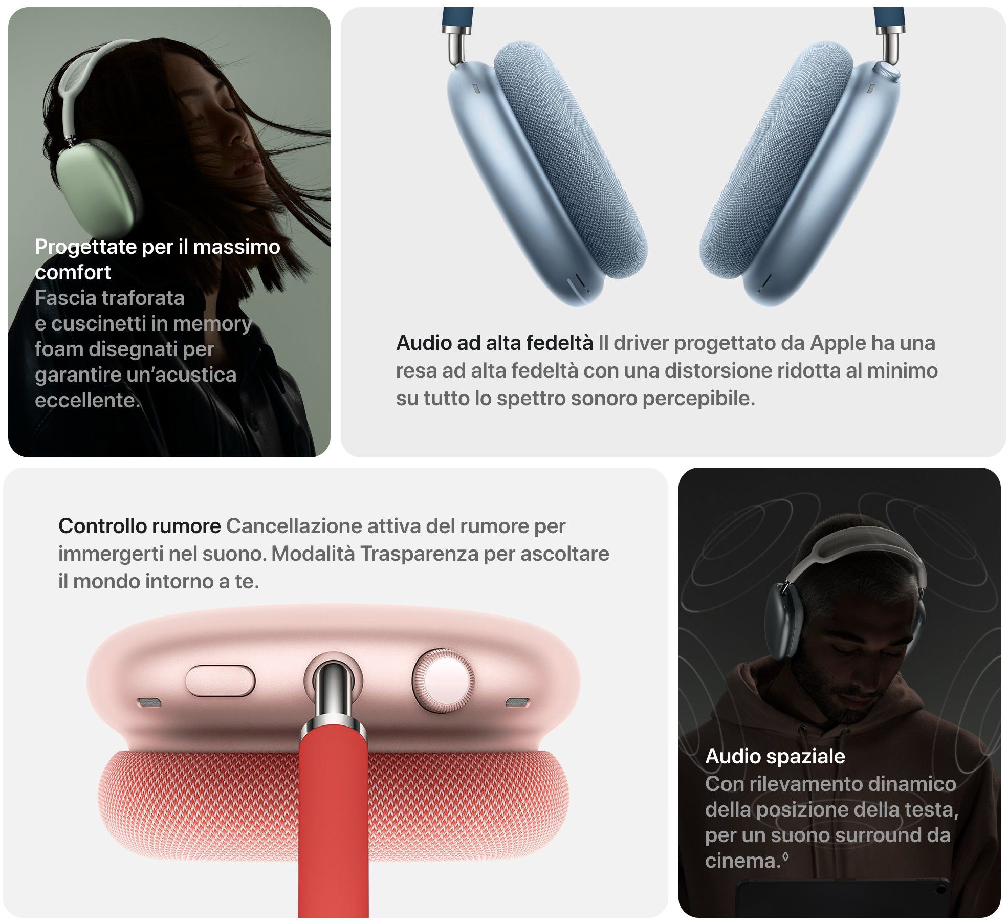 Con l’audio spaziale viene rilevata dinamicamente la posizione della testa per un effetto surround da cinema. E’ possibile attivare con un solo gesto la modalità trasparenza per ascoltare il mondo intorno a voi, rimuovendo l’isolamento che si viene a creare con le cuffie. Quando vorrete immergervi completamente nella musica potrete riattivare l’isolamento. Si collegano automaticamente ad iPhone ed altri dispositivi Apple, passando (sempre automaticamente) dall’uno all’altro in base a quello che state utilizzando.