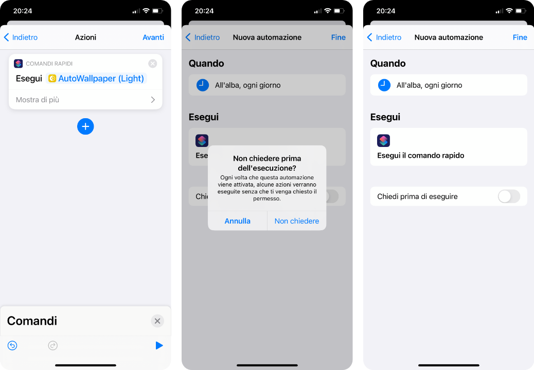 Noi però abbiamo trovato uno stratagemma per ottenere lo stesso risultato. Sfrutteremo l’applicazione “Comandi Rapidi” e sebbene la configurazione risulti più macchinosa, funziona decisamente bene e le automazioni che creeremo, potranno poi essere riutilizzate per qualsiasi sfondo sul nostro dispositivo. Sostanzialmente dovrete perdere 5 minuti la prima volta, dopodichè riuscirete a farlo continuamente all’istante. Vediamo come procedere.