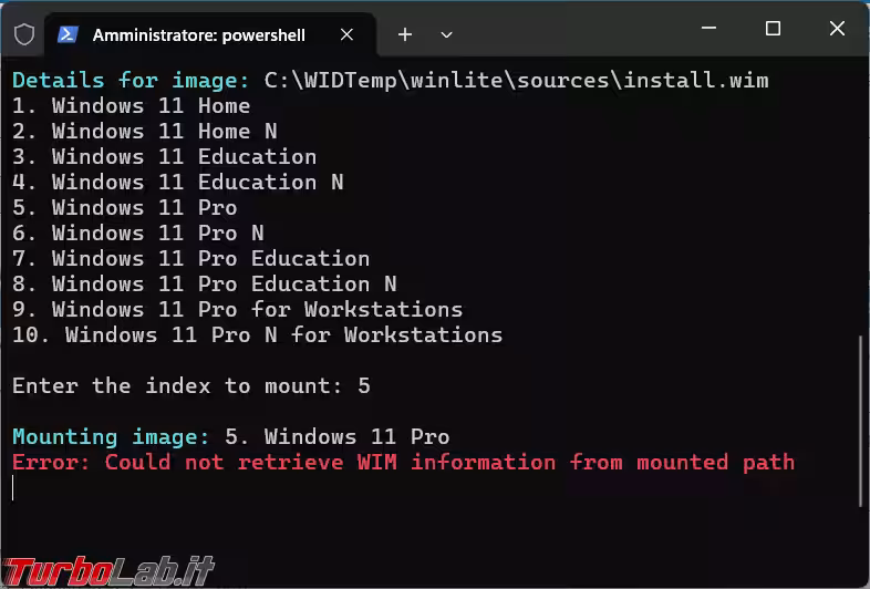 Durante la prova di uno script per la creazione di immagini ISO personalizzate di Windows qualcosa era andato storto e avevo dovuto interrompere il test in anticipo. Questa uscita forzata non aveva permesso di “smontare” l’immagine di Windows caricata in precedenza e non mi permetteva di “rimontarne” una per l’errore Could not retrieve WIM information from mounted path.