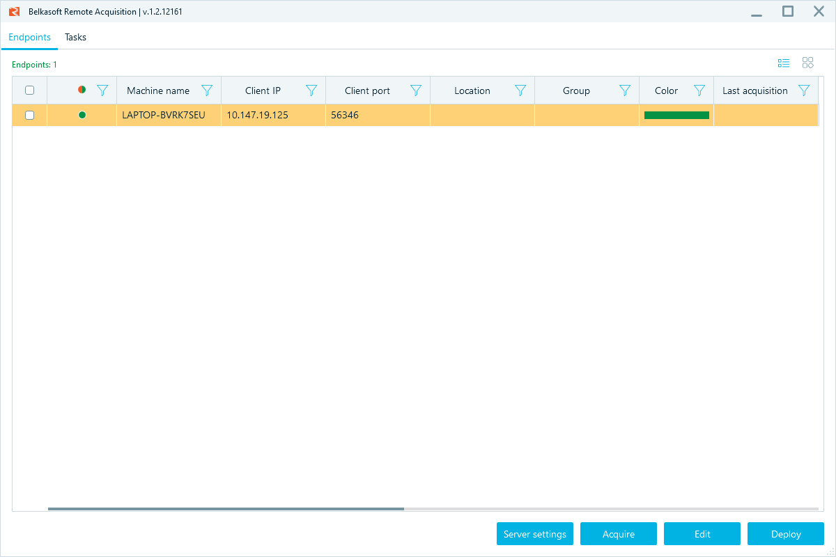 Nell’immagine, è presente un solo client, ovvero il notebook di test utilizzato, dal quale è possibile far partire l’acquisizione facendo click sulla funzione “Acquire”, che vedremo più avanti.
