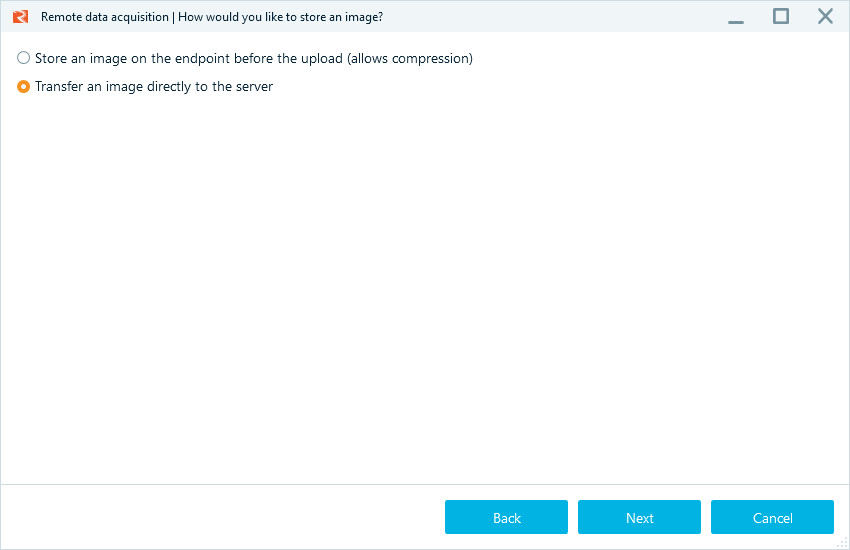 Infatti, Belkasoft R, permette di stabilire se la copia forense del dispositivo debba avvenire in locale, per poi essere trasferita al server remoto, oppure se debba avvenire direttamente al C&C.