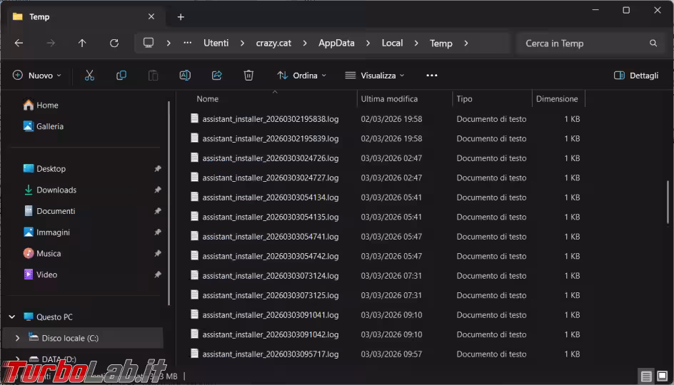 Guardando nella cartella Temp, dentro il mio account di Windows, trovo decine di file dal nome assistant_installer_xxxxxxx.log, tutti creati più volte al giorno e sempre in diversi orari.