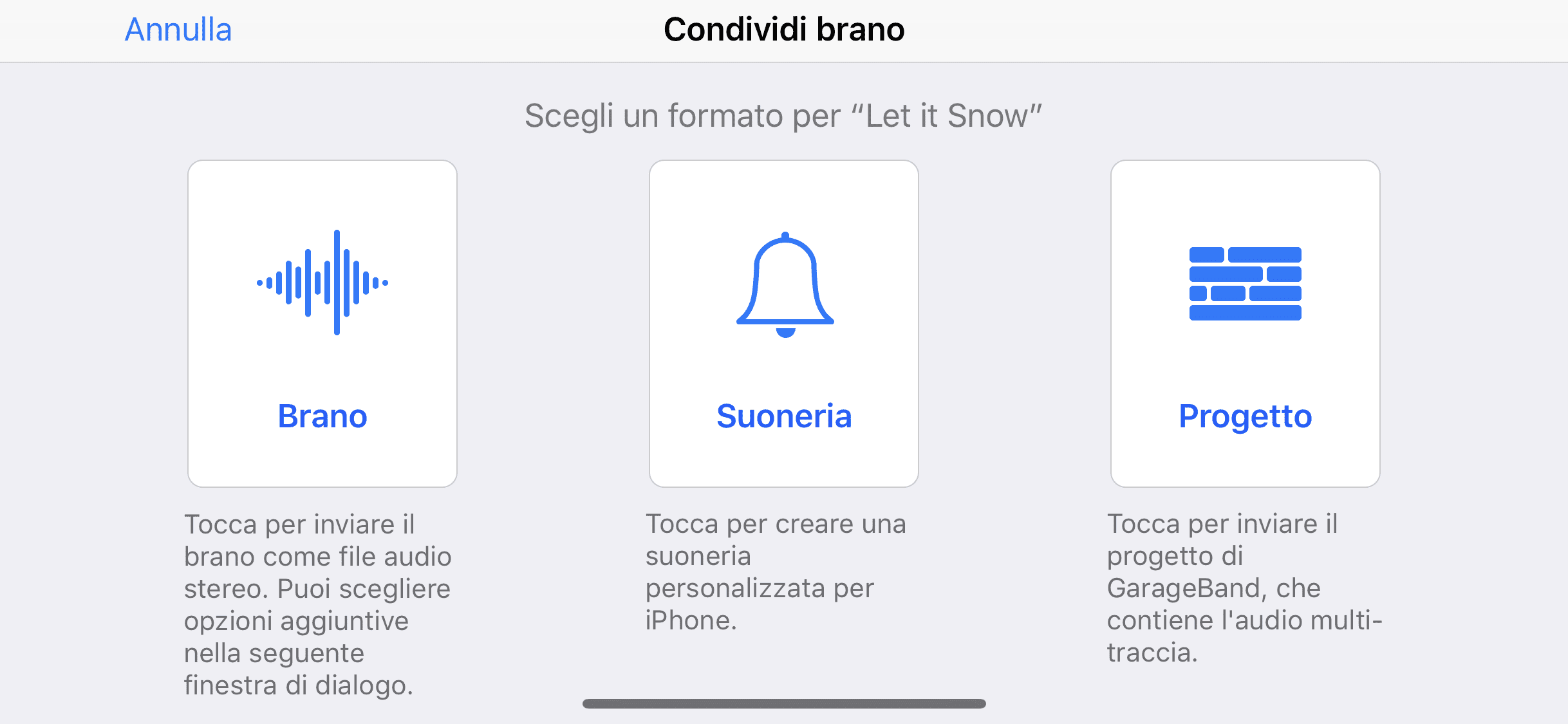4. Dopo aver premuto su “Copia su GarageBand”, la suoneria verrà trasferita e caricata. Attendete l’upload, dopodichè cliccate e tenete premuto per un secondo sul file. Appena lo rilascerete, apparirà un menu contestuale nero, dove dovrete selezionare “Condividi“.