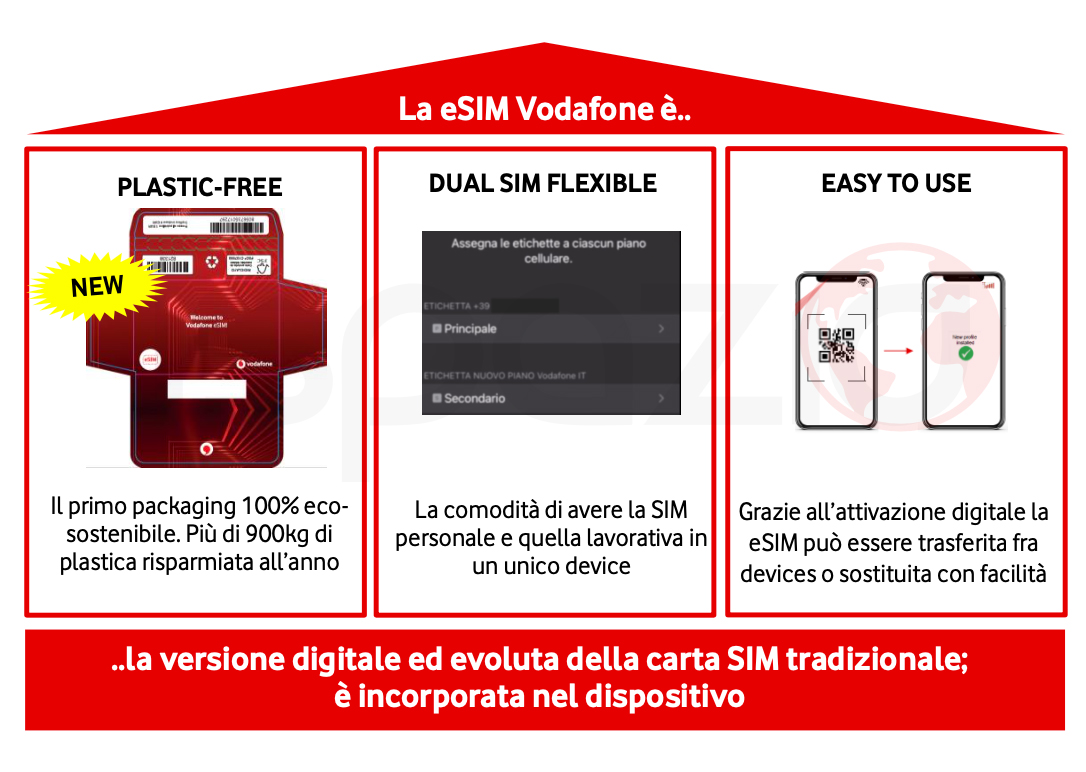 Vodafone punterà molto sul plastic-free. Il cliente infatti otterrà un cartoncino che farà risparmiare 900 Kg di plastica all’anno. Il vantaggio più grande che possiamo avere dall’utilizzo di una eSIM sta nel fatto che potremo utilizzare due schede sullo stesso dispositivo quindi chi utilizza un telefono per la vita privata ed uno per il lavoro, potrà finalmente lasciarne uno a casa.