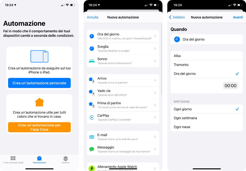 4. Tocchiamo su “Crea un’automazione personale” poi su “Ora del giorno” ed impostiamo l’ora in cui vogliamo che lo sfondi cambi automaticamente. Scegliendo 00:00, ad esempio, cambierà ogni mezzanotte, ma potete scegliere l’orario che preferite.
