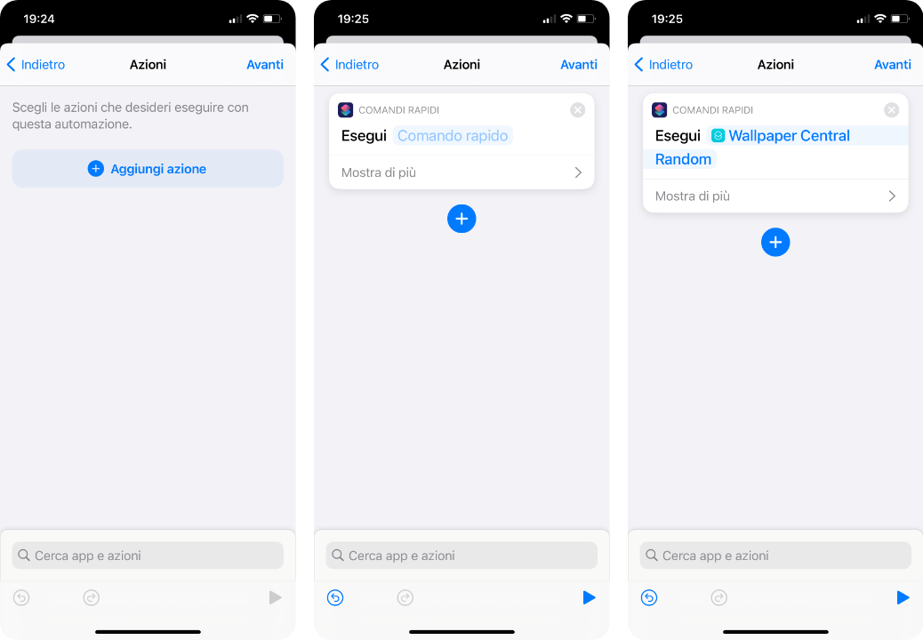 5. Andate Avanti, toccate su Aggiungi azione > Comandi Rapidi > Esegui comando rapido. Si creerà un box rettangolare, con una scritta azzurrina al suo interno. Toccate proprio su questa scritta chiara e selezionate “Wallpapers Central Random” dall’elenco:
