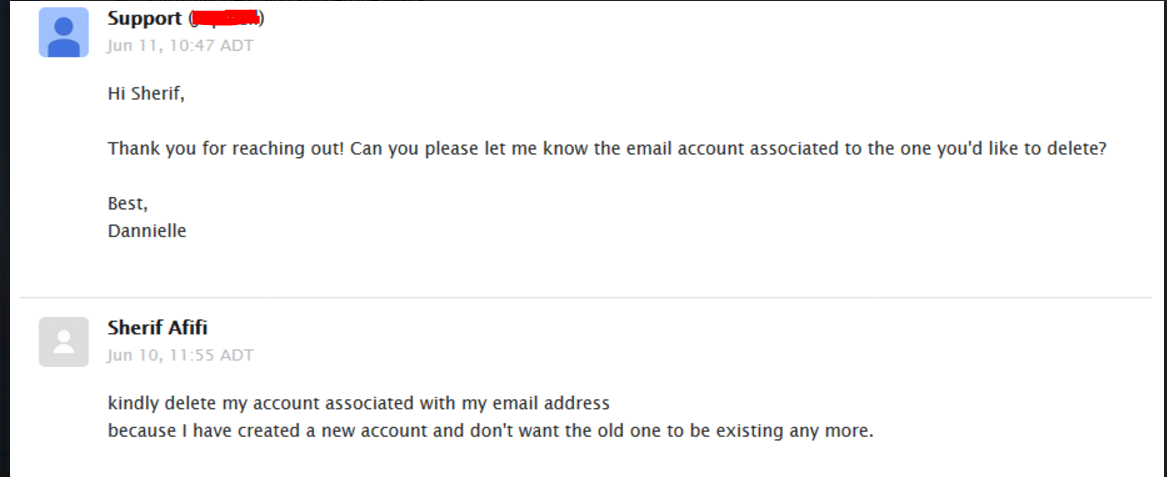 Ora, nel caso in cui volessi, nel nostro esempio (che comunque si tratta di una situazione reale) cancellare il mio account dalla piattaforma che chiameremo “Mario”, è obbligatorio contattare il team tecnico, come indicato nello screenshot qui sopra. Per fare ciò, dovrò fare il login sulla piattaforma ed aprire un ticket di assistenza. Questo farà si che la mia richiesta sia in qualche modo “verificata”, in quanto è necessario essere loggati con il proprio nome utente e password per poter inviare un messaggio di assistenza (nel quale, continuando nel nostro esempio, chiederò la cancellazione del mio account e tutti i relativi dati ad esso associati).