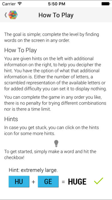 Avvincente ed originale puzzle game minimalista, pulito e divertente, contiene elementi simili a cruciverba. Puoi completare il gioco come preferisci tentando diversi approcci, non ci sono limiti di tempo, nessun punteggio che crea stress.