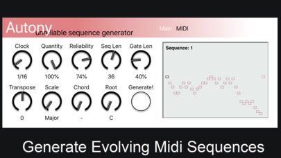 Midi sequencer molto interessante anche se ancora ha qualche problema di supporto. Un generatore di sequenze Midi che produce sequenze musicali che puoi ulteriormente automatizzare o modulare via MIDI.