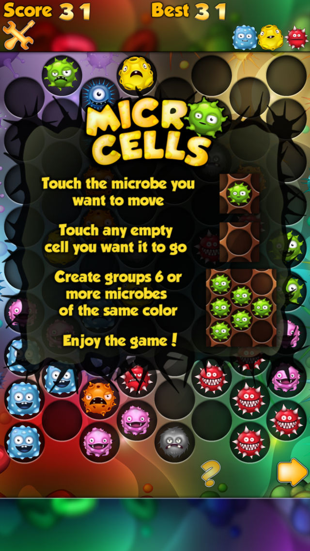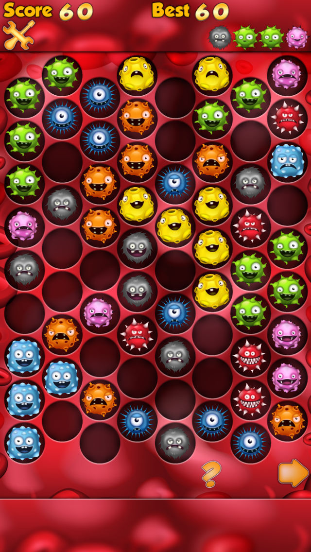 Gioco divertente il cui obbiettivo è sgombrare il campo da microbi buffi. Devi eliminare un gruppo di sei o più microbi dello stesso colore in un colpo. Una volta che i microbi sono raggruppati, il tuo punteggio aumenta, ed i microbi raggruppati scompaiono per far posto ad altre mosse. Dopo ogni turno, il tuo compito diventerà più difficile. Il gioco è finito quando la griglia si riempie completamente. Provalo, e vedi quanto riesci ad arrivare lontano.