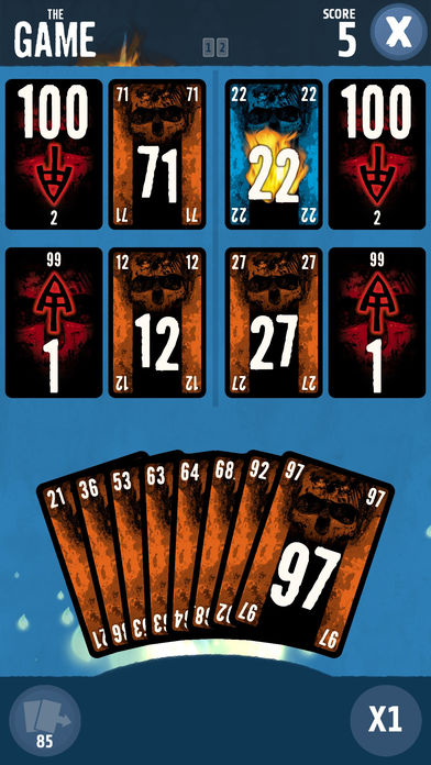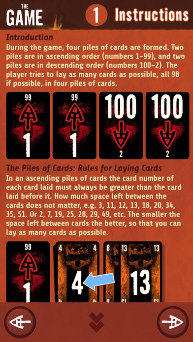 Gioco tipo solitario. Le regole sono semplici: si formano quattro pile di carte, due pali sono in ordine crescente (numeri 1-99) e due pali sono in ordine decrescente (numeri 100-2). Il giocatore cerca di posizionare il maggior numero possibile di carte, tutte le 98 se possibile, in quattro pile di carte, Starà a noi avere fortuna e giocare bene le nostre mani.
