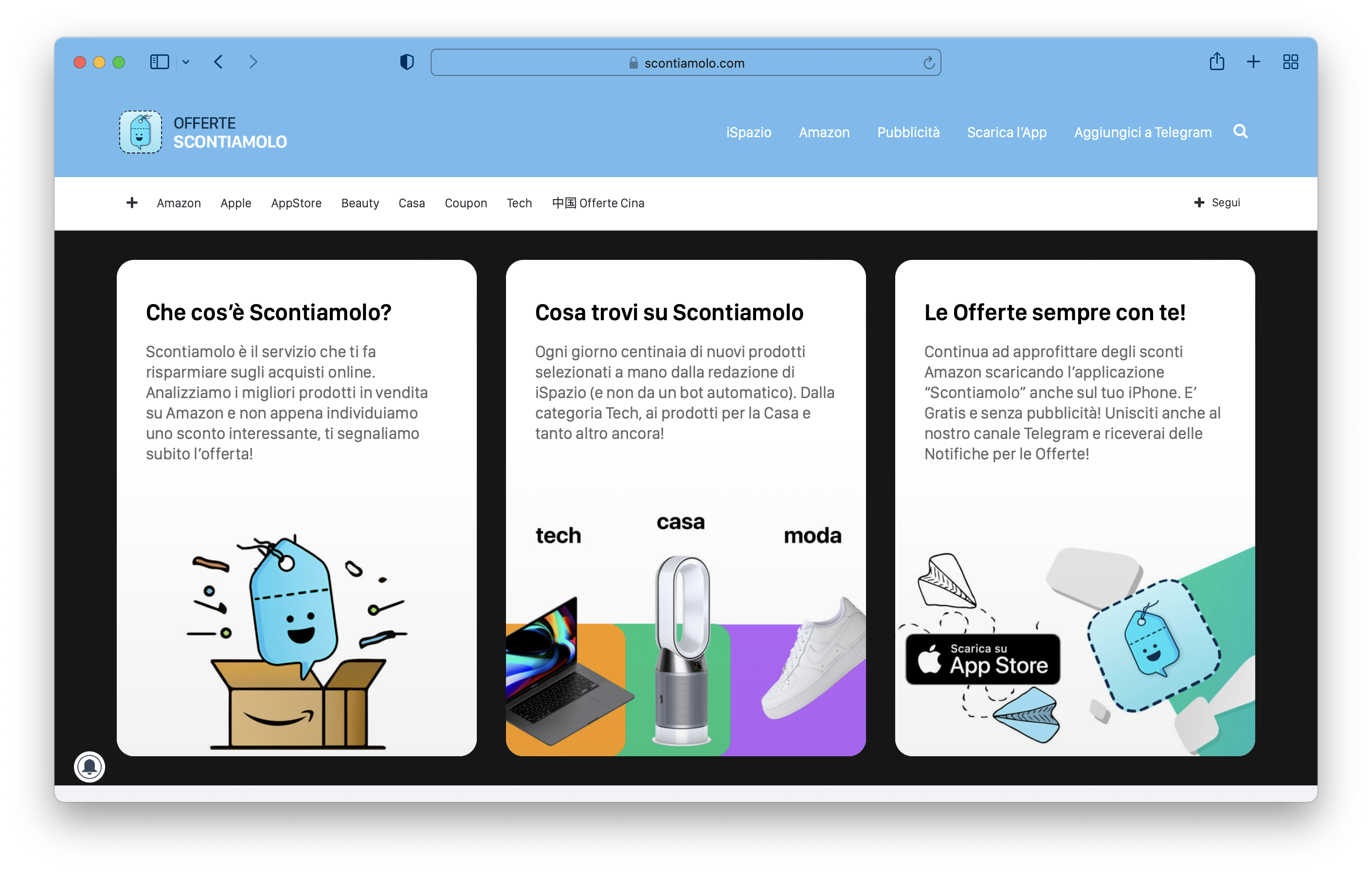 Si parte da una sezione superiore a sfondo scuro con delle Card informative molto eleganti ma al tempo stesso esaustive. In questo modo un nuovo visitatore avrà subito ben chiaro a cosa serve il sito, cosa troverà sullo stesso e come può continuare a seguire le offerte in mobilità tramite l’applicazione per iOS oppure il canale ufficiale su Telegram. Come potete notare, il logo è sempre lo stesso ma è stato colorato in maniera del tutto differente, creando una certa tridimensionalità e con colori più fedeli a quelli della vita reale.
