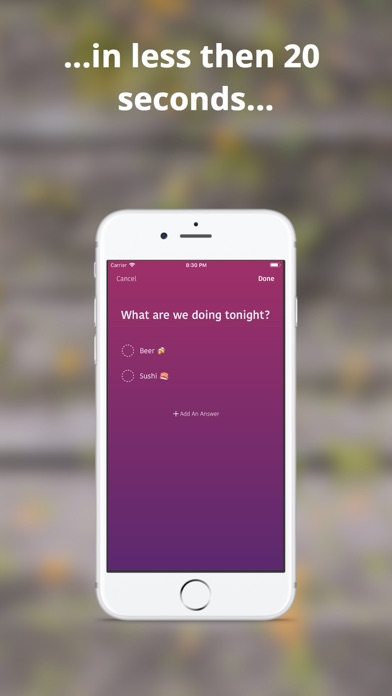 Con Poll! puoi creare sondaggi in meno di 20 secondi da condividere immediatamente con i tuoi amici su tutte le piattaforme come WhatsApp, Telegram, iMessage, Messenger, Facebook e tantissimi altri.