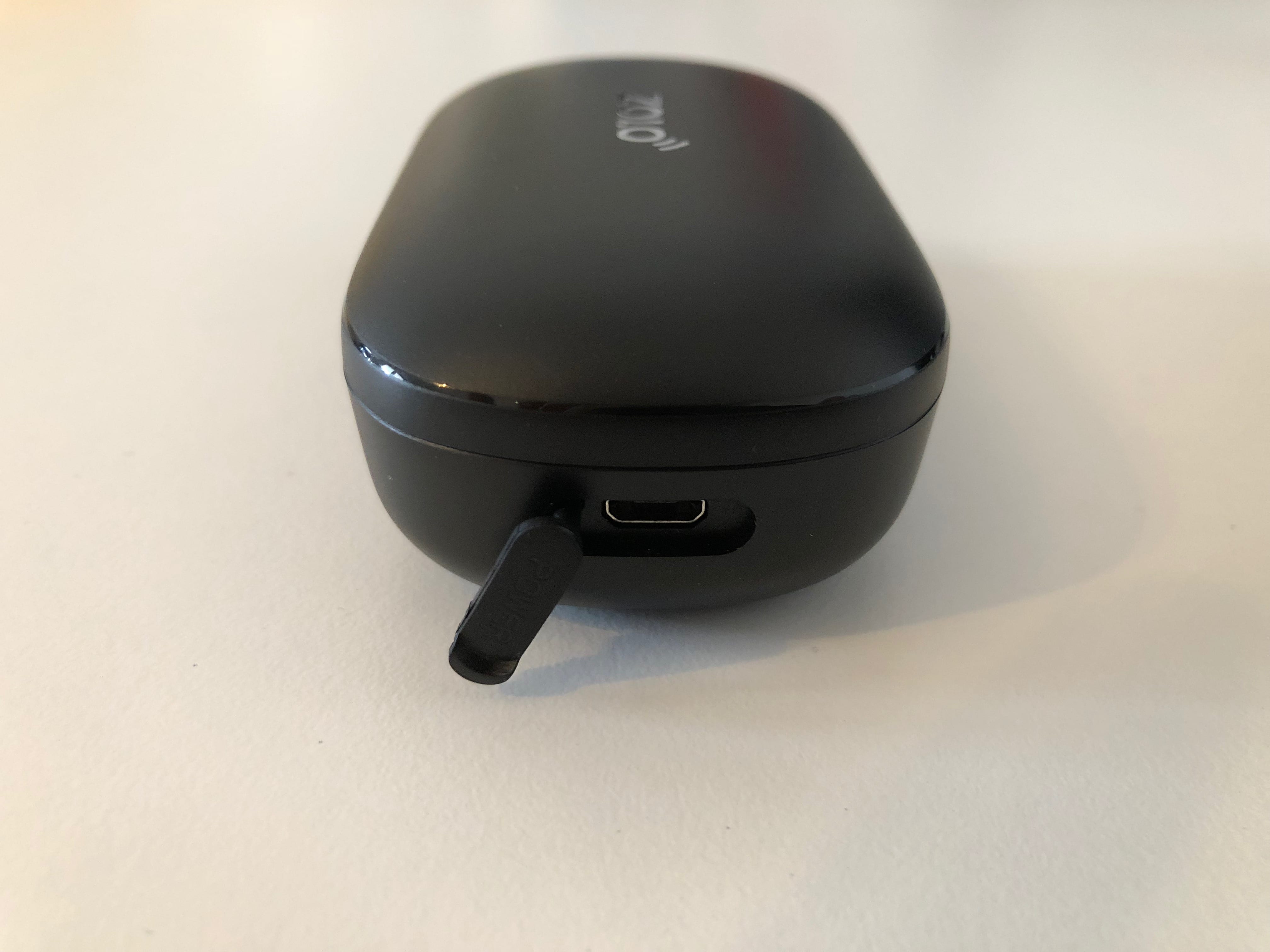Il case di ricarica ha un funzionamento simile a quello Apple. Presenta sulla parte superiore il logo Zolo, frontalmente 3 indicatori LED per controllare lo stato della ricarica e sul lato destro la porta micro USB. La ricarica della custodia può essere effettuata utilizzando il cavo giallo in nylon in dotazione.